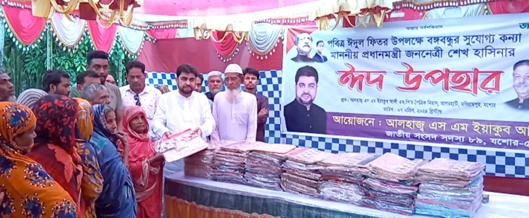 রোববার উপজেলার শ্যামকুড় ইউনিয়নে ও মণিরামপুর পৌরসভায় ১ হাজার নারী-পুরুষের মাঝে ঈদ উপহার শাড়ি, লুঙ্গি এবং নগদ অর্থ বিতরণ করেন যশোর-৫ আসনের সংসদ সদস্য এস এম ইয়াকুব আলী। এসময় তিনি বলেন, ঈদের আনন্দ ভাগাভাগি করতে প্রতি বছরের ন্যায় এবারো মাননীয় প্রধানমন্ত্রী শেখ হাসিনার নির্দেশে ঈদ উপহার বিতরণ করেছি। বর্তমান সরকার জনবান্ধব সরকার। সমাজের পিছিয়ে পড়া অসহায় মানুষের কল্যাণে কাজ করছে সরকার।