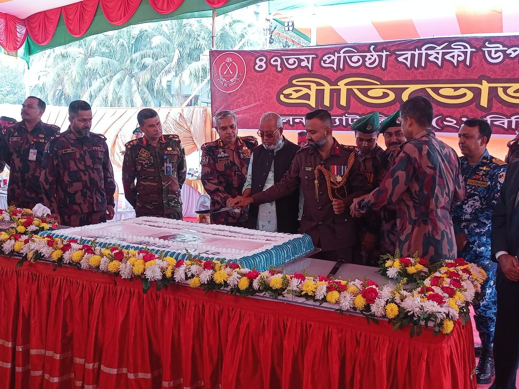 প্রায় আড়াই শ বছেরের পূরানো ঐতিহ্যবাহি বিজিবির রয়েছে দেশ ও জাতির কল্যানি সীমান্তে শান্তিশৃঙ্খলা রক্ষায় অনবাদ্য ভূমিকা। বাংলাদেশও মিয়ানমার সীমান্তে নাফ নদী রক্ষায় বিজিবি বলিষ্ট ভূমিকাসহ রয়েছে কতইনা সুনাম। জীবনের ঝুকিনিয়ে চেরাচালান প্রতিরোধ ও জঙ্গি সন্ত্রাস অনুপ্রবেশ রোধে অগ্রনী ভুমিকা পালন করে চলেছে বিজিবি বাহিনী। আজ খুলনা ব্যাটলিয়ন২১ বিজিবির ৪৭ তম প্রতিষ্ঠা বার্ষিকী উপলক্ষে উৎসব আনুষ্ঠানিকতার মধ্য দিয়ে দিবসটি পালিত হয়েছে। দুপুরে কেক কেটে দিবসটির উদ্ভোধন করেন খুলনা সিটি কর্পোরেশনের মেয়র তালুদার আব্দুল খালেক। এসময় উপস্তিত ছিলেন যশোর রিজিওনাল কমান্ডার ব্রিগেডিয়ার জেনারেল এ কে আযাদ খুলনা সেক্টর কমান্ডার কর্নেল মামুনুর রশিদ মামুন। ২১বিজিবি অধিনায়ক লেঃ কর্নেল তানভির রহমান.সহকারি পরিচালক আব্দুল আল মুহিত। এসময় মধ্যাহ্ন ভোজে অংশ গ্রহন করেন সেনা নৌ বিমান রেব বাহিনীর কর্মকর্তারাসহ প্রশাসনের কর্মকর্তা। সরকারি বেসরকারি প্রতিনিধি ও গনমাধ্যমম কর্মিসহ বিভিন্ন এলাকায় কর্মরত বিজিবি কমান্ডাররা উপস্তিত ছিলেন। এসময় অনুস্টানস্থল যেন মিলন মেলায় পরিনত হয়। আমন্ত্রিত অতিথিদের উদ্দেশ্যে বক্তব্য রাখেন ২১বিজিবি অধিনায়ক তানভির রহমান।