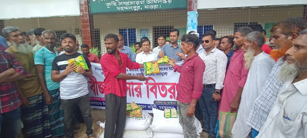 মাগুরার মহম্মদপুর উপজেলায় ক্ষুদ্র ও প্রান্তিক কৃষকদের মাঝে কৃষি প্রণোদনা কর্মসূচির আওতায় বিনামূল্যে সার ও বীজ বিতরণ করা হয়েছে।