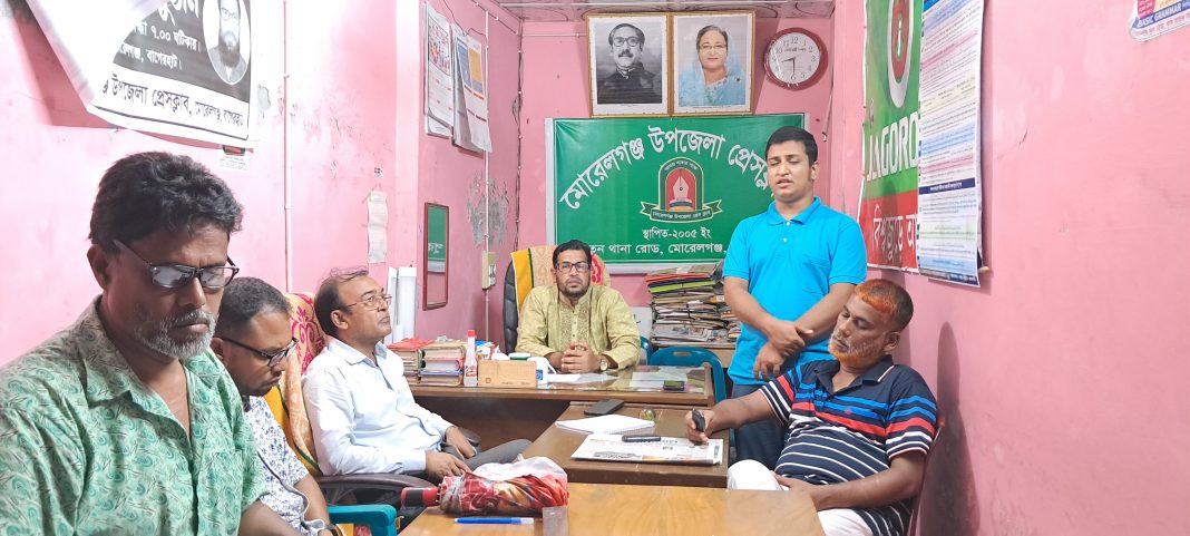 মোরেলগঞ্জ( বাগেরহাট )প্রতিনিধি:মোরেলগঞ্জ উপজেলা প্রেসক্লাবের নবনির্বাচিত কার্য নির্বাহী কমিটির প্রথম সভা ৩০ জুলাই সন্ধ্যায় অনুষ্ঠিত হয়েছে।২০২৩+২৪ জুলাই পর্যন্ত এর নব নির্বাচিত সভাপতি মো. আবু সালেহ’র সভাপতিত্বে এবং নব নির্বাচিত সাধারণ সম্পাদক দৈনিক ভোরের কাগজ ও দৈনিক প্রবর্তন প্রতিনিধি এইচ এম জসিম উদ্দিন সঞ্চালনায় উপজেলা প্রেসক্লাব কার্যালয়ে এ সভা অনুষ্ঠিত হয়েছে।