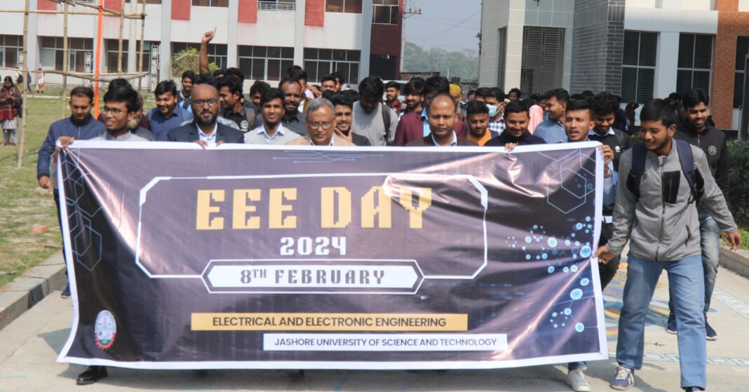 বিশেষ প্রতিনিধি:আনন্দ শোভাযাত্রা, পায়রা উড়ানো, কেক কাটা, খেলাধুলা সহ নানা আয়োজনের মাধ্যমে যশোর বিজ্ঞান ও প্রযুক্তি বিশ্ববিদ্যালয়ে (যবিপ্রবি) ইলেক্ট্রিক্যাল অ্যান্ড ইলেক্ট্রনিক ইঞ্জিনিয়ারিং (ইইই) বিভাগের এক যুগ পূর্তি ও ইইই ডে পালন করা হয়েছে।