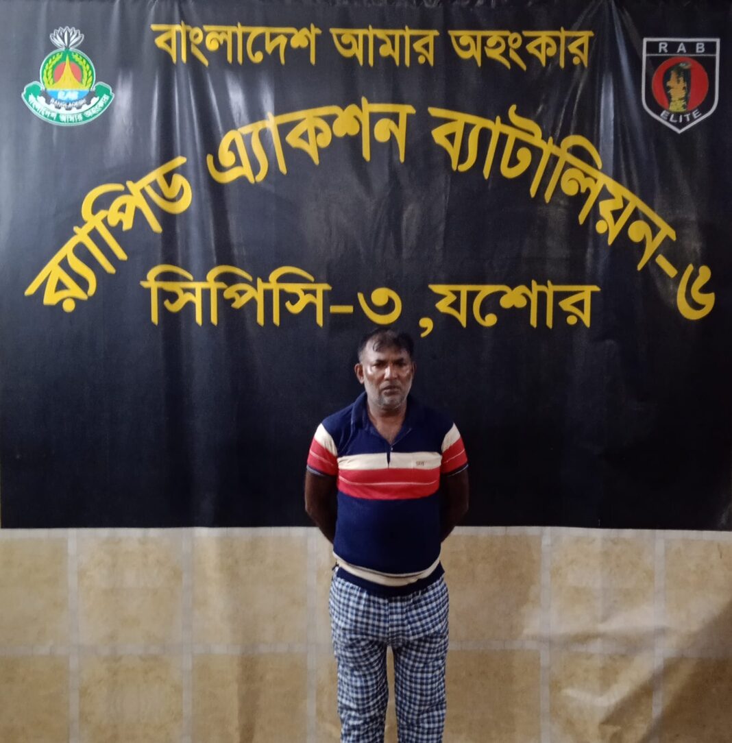 র্যাব সূত্রে জানা যায়,গোপন সংবাদের ভিত্তিতে বুধবার (১৫ মে) সন্ধ্যায় র্যাব-৬, যশোর ক্যাম্পের একটি দল অভিযান চালিয়ে আবু সাঈদ শেখ (৪১) নামের ওই ব্যক্তিকে আটক করে। তিনি নড়াইল জেলার মীরাপাড়া (আটেরহাট) গ্রামের মৃত জব্বার শেখের পুত্র।