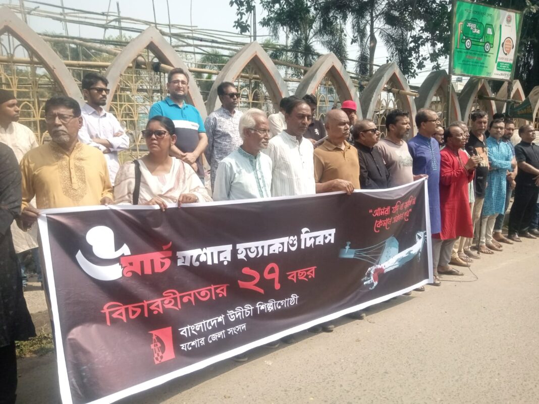‘আমরা যদি না জাগি মা, কেমনে সকাল হবে’ শিরোনামে যশোর হত্যাকাণ্ড দিবসের এই প্রতিবাদ মানববন্ধনে সভাপতিত্ব করেন উদীচী যশোর জেলা সংসদের সভাপতি অ্যাডভোকেট আমিনুর রহমান হিরু। বক্তব্য দেন, যশোর সংবাদপত্র পরিষদের সভাপতি মুক্তিযোদ্ধা একরাম-উদ-দ্দৌলা, শিল্পকলা অ্যাকাডেমি যশোরের সাবেক সাধারণ সম্পাদক অ্যাডভোকেট মাহমুদ হাসান বুলু, সম্মিলিত সাংস্কৃতিক জোট যশোরের সাধারণ সম্পাদক সানোয়ার আলম খান দুলু, চাঁদের হাট যশোরের সভাপতি ফারাজী আহমেদ সাঈদ বুলবুল, যশোর কলেজের অধ্যক্ষ মোস্তাক হোসেন শিম্বা, উদীচী সাধারণ সম্পাদক সাজ্জাদুর রহমান খান বিপ্লব, সংস্কৃতিজন বাসুদেব বিশ্বাস প্রমুখ। সমাবেশে নেতারা উদীচী হত্যাকাণ্ডের পুনঃতদন্ত ও প্রকৃত অপরাধীদের চিহ্নিত করে দৃষ্টান্তমূলক শাস্তির দাবি জানান।
