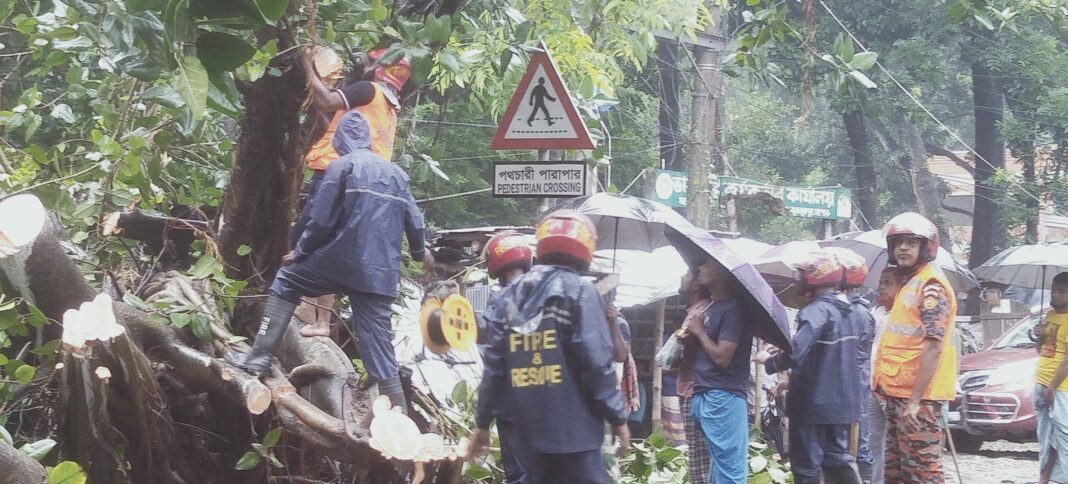 যশোরে  টানা বর্ষণে রাস্তায় ওপড়ে পড়ল সেই বটগাছটি