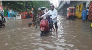 মুষলধারে বৃষ্টিতে গোটা যশোর শহরে হাটুপানি জমেছে। এতে বিপর্যস্ত হয়ে পড়েছে জনজীবন। সকাল থেকে এই টানা বৃষ্টির পানিতে টইটুম্বুর হয়ে যায় শহরের নীচু এলাকা,বাড়ি-ঘর,মাঠ-বাজার। শহরের গুরুত্বপূর্ণ এলাকা, কোর্টমোড়, প্যারিস রোড, রেলরোড, মনিহার এলাকা সহ বিভিন্ন সড়কে পানি জমে রীতিমতো চলাচল অযোগ্য হয়ে পড়েছে। এতে পথচারী, স্কুলগামী শিক্ষার্থী, রোগী ও যানবাহনের চালকরা পড়েছেন চরম দুর্ভোগে।
