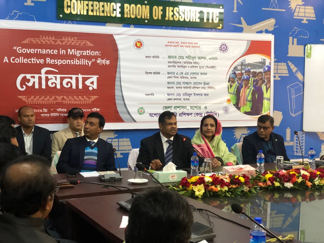 নিজস্ব প্রতিবেদক: যশোর কারিগরি প্রশিক্ষণ কেন্দ্র (টিটিসি) থেকে প্রশিক্ষণ নিয়ে গত পাঁচ বছরে সাড়ে ৩৫ হাজার তরুণ বিদেশ পাড়ি জমিয়েছেন। যাদের মাধ্যমে দেশে আসছে বিপুল অংকের রেমিট্যান্স। শনিবার দুপুরে টিটিসি যশোর কেন্দ্রে ‘গর্ভনেন্স ইন মাইগ্রেশন এ কালেক্টিভ রেসপনসিভিলিটি’ শীর্ষক সেমিনারে এতথ্য জানানো হয়। তথ্য উপস্থাপন করেন অনুষ্ঠানের প্রধান অতিথি জনশক্তি কর্মসংস্থান ও প্রশিক্ষণ ব্যুরোর (বিএমইটি) মহাপরিচালক শহীদুল আলম।