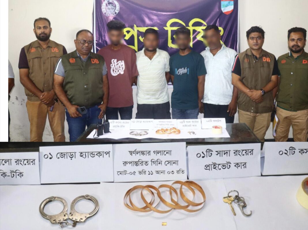 যশোরে পুলিশ পরিচয়ে সংঘটিত আলোচিত স্বর্ণ ডাকাতি মামলায় চারজন আসামিকে গ্রেফতার করেছে কোতোয়ালী মডেল থানা ও জেলা গোয়েন্দা পুলিশ (ডিবি)। তাদের কাছ থেকে ডাকাতির কাজে ব্যবহৃত হ্যান্ডকাপ, ওয়াকি-টকি, কসটেপ ও একটি প্রাইভেটকারসহ লুণ্ঠিত সোনার অংশবিশেষ উদ্ধার করা হয়েছে।