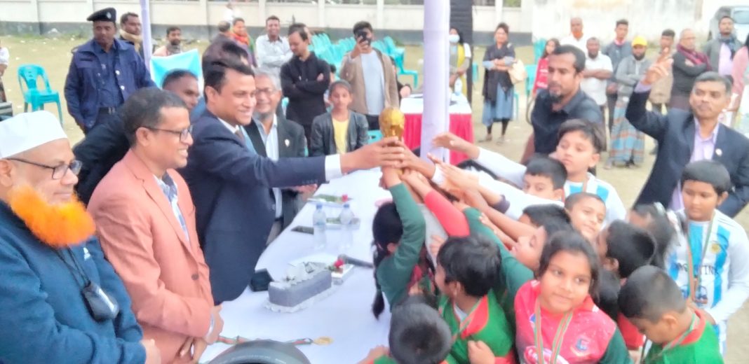 নিজস্ব প্রতিবেদক: যশোরে ুদে শিার্থীদের নিয়ে হয়ে গেল একটি বিশ্বকাপের উৎসব। যার আয়োজনে ছিল ব্রাদার্স টিটোস হোম। তাদের শিার্থীদের নিয়ে গঠন করা হয় দুটি দল। নাম দেওয়া হয় বাংলাদেশ ও আর্জেন্টিনা। লাল সবুজের জার্সি পরিহিত শিশুদের মধ্যে ছিলো ভিন্ন এক আমেজ। আর আকাশী নীল জার্সি পরিহিত শিশুদের মধ্যেও একই অবস্থা।সোমবার বিকেলে কেন্দ্রীয় ঈদগাহে শিশুদের এ ম্যাচটি অনেকেই উপভোগ করেছেন আনন্দ চিত্তে।অনুষ্ঠানে প্রধান অতিথি হিসাবে উপস্তিত ছিলেন জেলা প্রশাসক তমিজুল ইসলাম খান। বিশেষ অতিথি ছিলেন যশোর জেলা ক্রীড়া সংস্থার সহসভাপতি এজেডএম সালেক, জাতীয় দলের সাবেক ফুটবলার মাসুক মোহাম্মদ সাথী, প্রেসকাব যশোরের সম্পাদক এস এম তৌহিদুর রহমান, ব্যবসাীয় ও সমাজসেবক জাকির হোসেন পলাশ।প্রধান অতিথির বক্তব্যে তিনি বলেন, ‘আমরা একটি সুস্থ-মেধাবি একটি প্রজন্ম চাই। সেই প্রজন্মকে সুস্থ ও মেধাবি ভাবে পরিচালিত করতে চাই; তাহলে শুধু পড়াশুনা করলেই হবে না। একাডেমিক পড়াশুনার বাইরে যে কাজটি করতে হবে সেটি ক্রীড়া চর্চা। ক্রীড়া চর্চা যে শুধু শরীরের চর্চা তা কিন্তু নয়; এটি মানুষের বিকাশ ঘটায়। সুস্থ চিন্তা-সুস্থ জীবনবোধ ঘটায়।অভিভাবকদের উদ্যেশ্যে তিনি বলেন, সন্তানদের যে শুধু জিপিএ-৫ পাওয়ার আকাঙ্খা না করে ভালো মানুষ গড়ার আকাঙ্খা করতে হবে। ছেলে মেয়েদের ডিভাইস আসক্তি থেকেও অভিভাবকদের রা করতে হবে। শেষ পর্যন্ত এ ম্যাচে বাংলাদেশ ৩-২ গোলে পরাজিত করে আর্জেন্টিনাকে। খেলা শেষে বিজয়ী বাংলাদেশ দলের হাতে বিশ্বকাপের আদলের ট্রফি তুলে দেয়া হয়।
