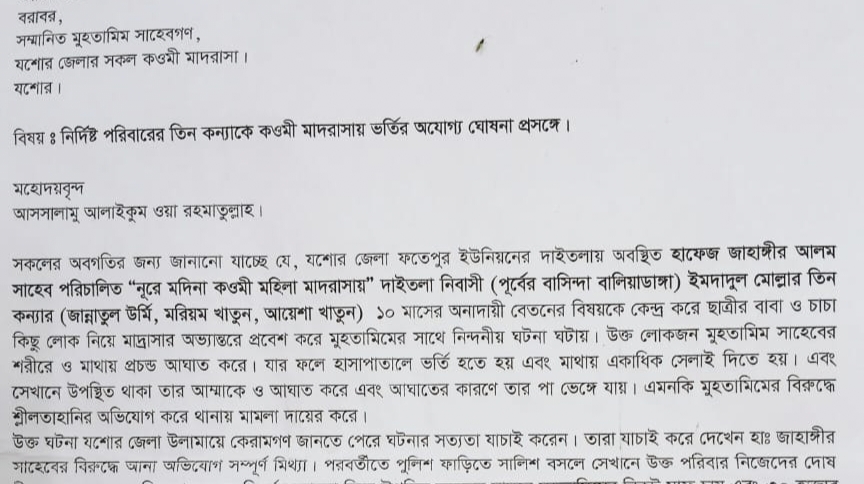 পত্রে ওই পরিবারের তিন কন্যা জান্নাতুল উর্মি (হেফজ বিভাগ), মরিয়ম খাতুন (মিজান জামাত বিভাগ) ও শিশুকন্যা আয়শা খাতুন (দ্বিতীয় শ্রেনীকে) কওমি মাদ্রাসায় ভর্তি করার অযোগ্য ঘোষণা করা হয়।