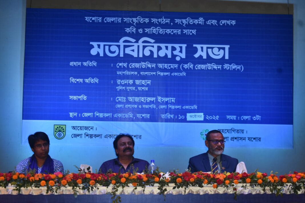 যশোর জেলার সাংস্কৃতিক সংগঠন, সংস্কৃতিকর্মী, লেখক-কবি ও সাহিত্যিকদের সাথে মতবিনিময় সভা আজ (শুক্রবার) বিকালে যশোর শিল্পকলা একাডেমি অডিটোরিয়ামে অনুষ্ঠিত হয়। সভায় প্রধান অতিথি ছিলেন বাংলাদেশ শিল্পকলা একাডেমির মহাপরিচালক শেখ রেজাউদ্দিন আহমেদ (রেজাউদ্দিন স্টালিন)।