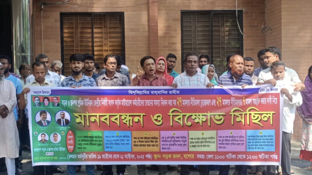 বাংলাদেশ সড়ক ও জনপথ শ্রমিক ইউনিয়নের কেন্দ্রীয় নির্বাহী সংসদের ঘোষিত কর্মসূচির অংশ হিসেবে যশোর সড়ক ভবন প্রাঙ্গণে মানববন্ধন ও বিক্ষোভ মিছিল অনুষ্ঠিত হয়েছে। রবিবার (১৯ অক্টোবর) বেলা ১১টা থেকে ১২টা পর্যন্ত এ কর্মসূচি পালিত হয়।