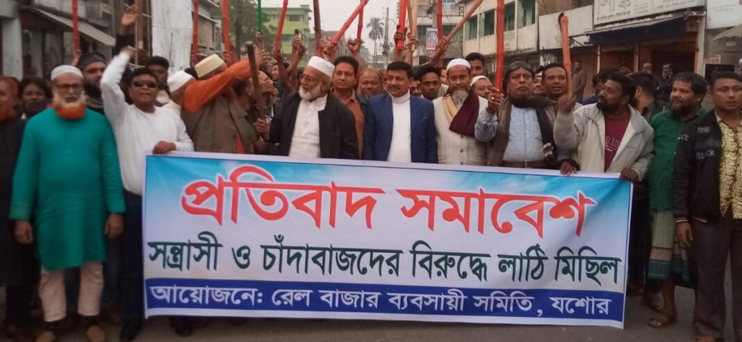 সন্ত্রাসী ও চাঁদাবাজদের বিরুদ্ধে ফের ফুঁসে উঠেছে যশোর রেল বাজারের ব্যবসায়ীরা। বাধ্য হয়ে তারা বিক্ষোভ সমাবেশ ও লাঠি মিছিল করেছে।