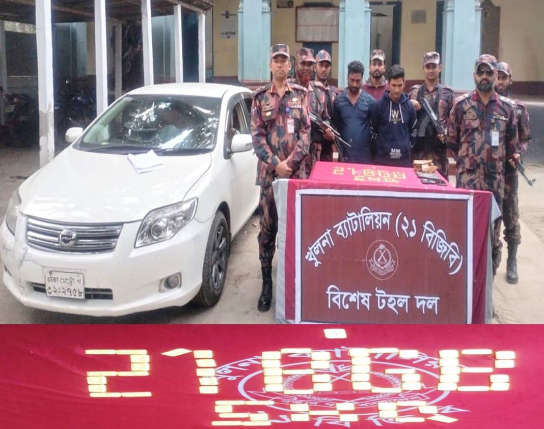 খুলনা সেক্টর কমান্ডার মামুনুর রশিদ জানান.ভারতে পাচার কালে বুধবার বিকালে শার্শার পাঁচ কায়বা এলাকা থেকে ২১ বিজিবির অধিনায়ক লে কর্নেল তানভির রহমানের নের্তৃত্বে একদল বিজিবি বিশেষ কায়দায় কসটেপে মোড়ানো লোকানো স্বর্নসহ একটি প্রাইভেট জব্দ করে। পরে প্রাইভেট কারের ষ্টারিংয়ের সামনে মিটারবক্সের মধ্য থেকে উদ্ধার করা হয় চালানটি।এসময় আটক করা হয় সোনা পাচারের সাথে জড়িত শফিকুল ও হান্নান হোসেনকে