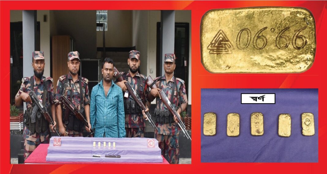 বিজিবি জানায়, যশোর ব্যাটালিয়ন (৪৯ বিজিবি) এর একটি টহলদল গোপন সংবাদের ভিত্তিতে যশোরের ঝুমঝুমপুর এলাকা হতে ০১ জন আসামীসহ ৫৮৫.৫৪ গ্রাম ওজনের ০৫(পাঁচ) টি স্বর্ণের বার এবং ০১টি মোবাইল আটক করে।