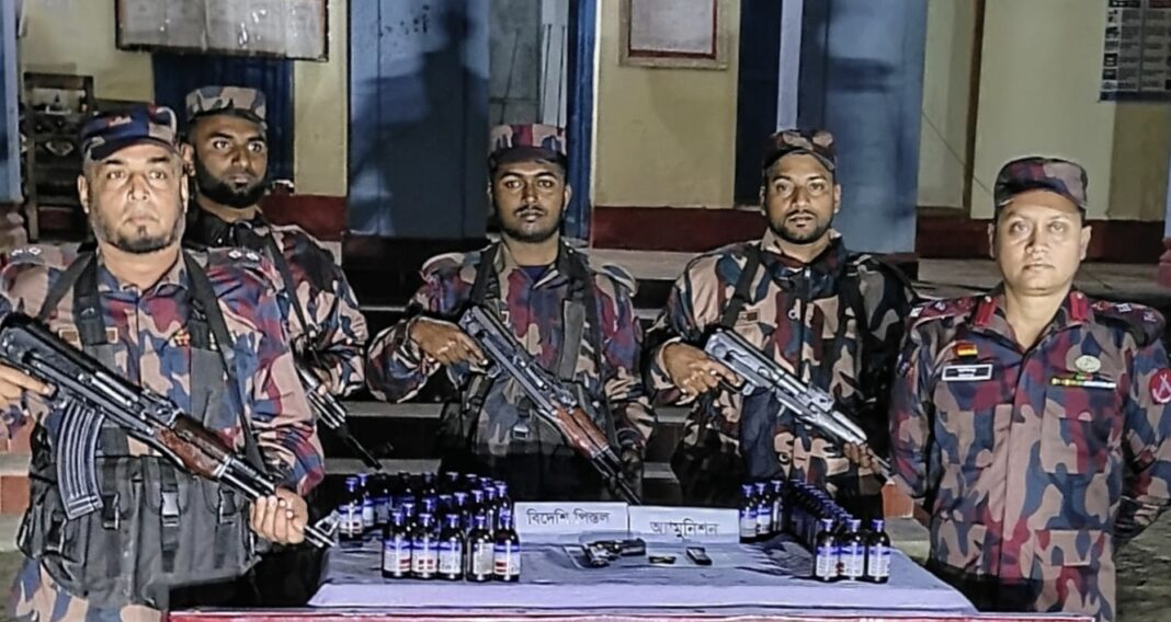 বিজিবি সূত্রে জানা যায়, মঙ্গলবার (১০ফেব্রুয়ারি ২০২৬) ভোর সাড়ে পাঁচটার দিকে কায়বা বিওপি’র টহল দল সীমান্তের প্রায় ৫০ গজ বাংলাদেশের অভ্যন্তরে কায়বা গ্রামের দাদখালী নামক স্থানে অভিযান পরিচালনা করে। এসময় পাকা রাস্তার পাশে অজ্ঞাত ব্যক্তির ফেলে যাওয়া একটি ব্যাগ তল্লাশি চালিয়ে ১টি ৭.৬৫ এমএম চায়না পিস্তল, ১টি ম্যাগাজিন,৫ রাউন্ড গুলি এবং ৪০বোতল ভারতীয় এস্কার্প সিরাপ উদ্ধার করা হয়।