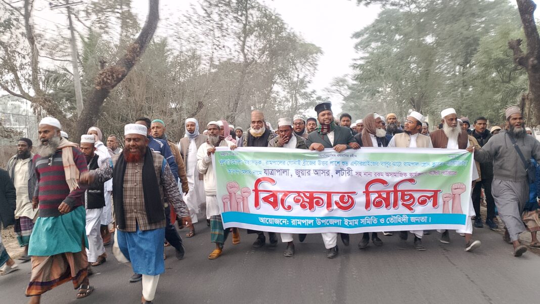 শেখ মাসুম বিল্লাহ,রামপাল(বাগেরহাট)প্রতিনিধিঃ বাগেরহাটের রামপালে গোনাইব্রিজ এলাকায় শুভ এন্টারপ্রাইজের বালুর মাঠে রামপাল প্রেসক্লাব’র আয়োজনে মাসব্যাপী আনন্দ মেলার নামে যাত্রাপালা, জুয়ার আসর, লটারীসহ অসামাজিক কার্যকলাপ বন্ধের দাবিতে বিক্ষোভ মিছিল ও প্রতিবাদ সমাবেশ করেছে রামপাল উপজেলা ইমাম সমিতি ও তৌহিদী জনতা।