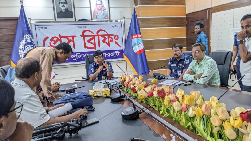রামপাল(বাগেরহাট)প্রতিনিধিঃ বাগেরহাটের রামপাল তাপবিদ্যুৎ কেন্দ্রের অভ্যন্তরে সন্ত্রাসী বাহিনীর হামলার ঘটনায় প্রাথমিক জিজ্ঞাসাবাদের জন্য পুলিশ ১১ জনকে আটক করছে। বৃহস্পতিবার (৪ এপ্রিল) বেলা এগারোটায় বাগেরহাট পুলিশ সুপারের কার্যালয়ে এ সংক্রান্ত এক প্রেস ব্রিফিংয়ে এ তথ্য নিশ্চিত করেছেন অতিরিক্ত পুলিশ সুপার রাসেলুর রহমান।