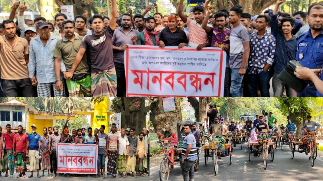 যশোরের শার্শায় ভ্যানরিক্স্য চালকদের গুম, খুন, অপহরন ও নৈরাজ্যেকারিদের শাস্তির দাবিতে রিক্সা-ভ্যান শ্রমিকরা বিক্ষোভ মিছিল ও মানববন্ধন করেছে।