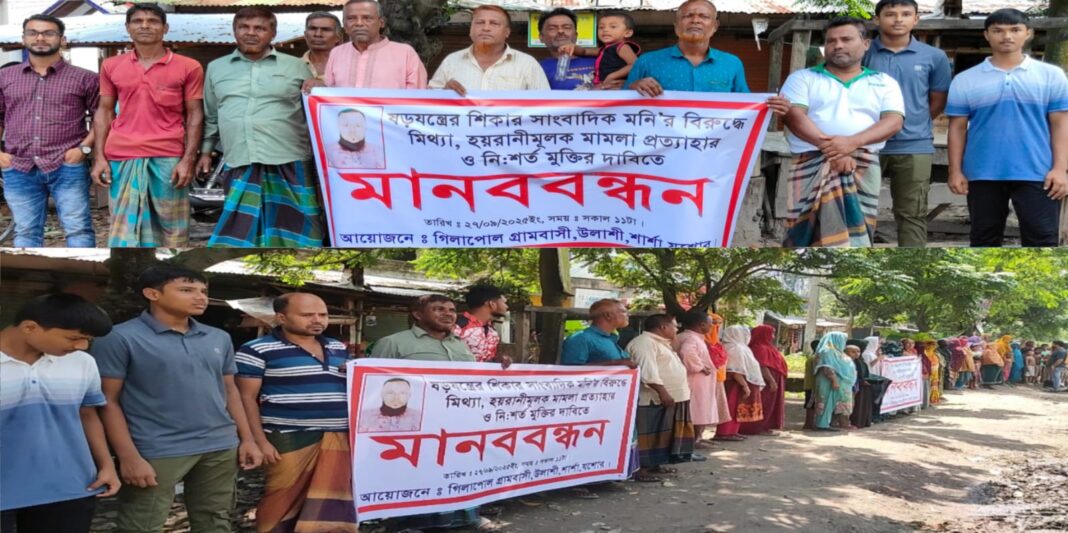 শার্শা প্রতিনিধি : যশোরের শার্শায় যড়যন্ত্রের শিকার সাংবাদিক মনিরুল ইসলাম মনি’র বিরুদ্ধে মিথ্যা, হয়রানী মুলক মামলা প্রত্যাহার ও নি:শর্ত মুক্তির দাবিতে মানববন্ধন করেছে গ্রামবাসি।