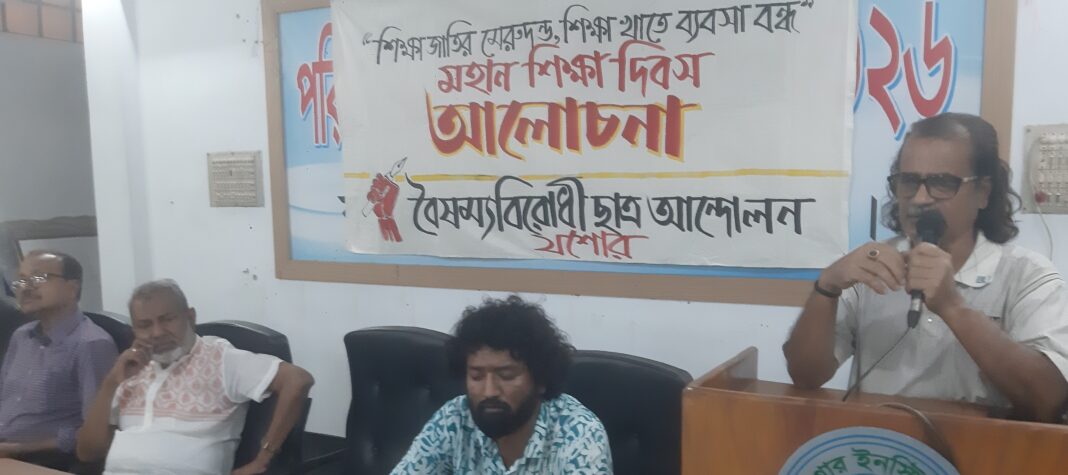 নিজস্ব প্রতিবেদক: মঙ্গলবার যশোরে মহান শিক্ষা দিবসে “শিক্ষা জাতির মেরুদন্ড, শিক্ষা খাতে ব্যবসা বন্ধ” শীর্ষক আলোচনা সভা অনুষ্ঠিত হয়েছে। বিকাল ৫ টায় যশোর ইনস্টিটিউট পাবলিক লাইব্রেরির কনফারেন্স রুমে বৈষম্য বিরোধী ছাত্র আন্দোলনের উদ্যোগে এই সভার আয়োজন করা হয়।