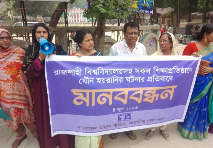 সাতক্ষীরা প্রতিনিধিঃ রাজশাহী বিশ্ববিদ্যালয় সহ দেশের সকল শিক্ষা প্রতিষ্ঠানে যৌন হযরানির ঘটনার প্রতিবাদে সাতক্ষীরা মানববন্ধন কর্মসূচি পালন করা হয়েছে। রবিবার (৪ জুন) সকালে শহীদ আঃ রাজ্জাক পার্কের সামনে বাংলাদেশ মহিলা পরিষদ সাতক্ষীরা জেলা শাখার আয়োজনে মানববন্ধন কর্মসূচি পালন করা হয়।