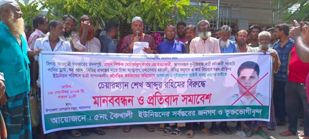 শ্যামনগর প্রতিনিধিঃ সাতক্ষীরার শ্যামনগরের ৫নং কৈখালী ইউনিয়নের চেয়ারম্যান শেখ আব্দুর রহিমের বিরুদ্ধে দুর্নীতি ও অনৈতিক কর্মকাণ্ডের অভিযোগে ইউনিয়নের সর্বস্তরের জনগণ ও ভূক্তভোগীরা আজ উপজেলা প্রেসক্লাব চত্ত্বরে এক মানববন্ধন ও প্রতিবাদ সমাবেশের আয়োজন করে।