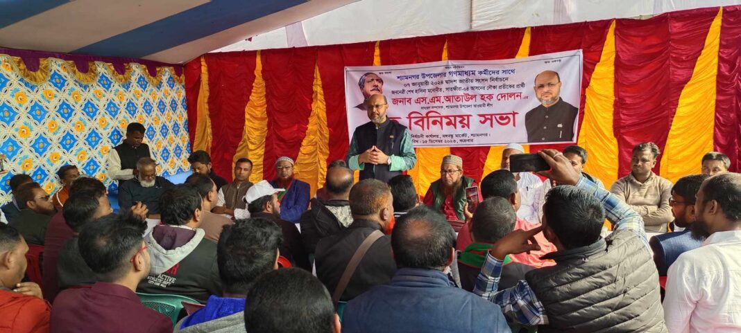 মত বিনিময় সভায় এস এম আতাউল হক দোলন বলেছেন সুপেয় পানি নিশ্চিত ও মজবুত নদী রক্ষা বাঁধ নির্মাণ ও যোগাযোগ ব্যবস্থায় সর্বোচ্চ গুরুত্ব দেওয়া হবে ,ষাটের দশকে নির্মিত পানি উন্নয়ন বোর্ডের নদী রক্ষা বাঁধ গুলি যুগোপযোগী ভাবে নির্মাণ, সুপেয় পানির ব্যবস্থা নিশ্চিত করা ও এলাকায় আধুনিক মানের যোগাযোগ ব্যবস্থা গড়ে তোলায় সর্বোচ্চ অগ্রাধিকার দেওয়া হবে,সকল মানুষকে সমানভাবে মূল্যায়ন করা হবে,আমার থাকবে না নিজস্ব কোন বাহিনী।