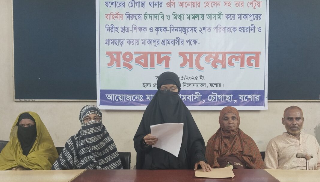 অভিযোগে আরও বলেন, ওসি আনোয়ার, এসআই মারুফ ও হোসেন বিরুদ্ধে ইতমধ্যে চৌগাছার বিভিন্ন এলাকায় চাঁদাবাজী, জবরদখল, লুটপাট ও হুমকিসহ মাদককারবারীকে সহায়তা করার অভিযোগ রয়েছে। এসব নিয়ে বিভিন্ন সংবাদ মাধ্যমের সংবাদ প্রকাশিতও হয়েছে। গত ৭মে ওসি আনোয়ারের পক্ষে এসআই মেহেদী হাসান মারুফ (চৌগাছা থানার মামলা নং-০৭, মি.আর-১০৩/২৫) মামলা করেছেন, যা সম্পূর্ণ মিথ্যা, ভিত্তিহীন ও বানোয়াট ঘটনাকে উল্লেখ করে করা হয়েছে। তিনি অসত্য ও বিধান্তীকর তথ্য নিয়ে সত্য ঘটনাকে আড়াল করে ৩৬ জনের নাম উল্লেখ করে এবং ১৫০ জনকে অজ্ঞাতনামা দেখিয়ে মামলা করেছেন। গ্রামবাসী পুলিশের কাজে কোনো বাধা দেননি এবং কাউকে কোনো আঘাত করেননি, বরং পুলিশ ছিলো মারমুখি তার অনেক ভিডিও ফুটেজ রয়েছে। আমরা এর সুষ্ঠু তদন্ত চাই। সংবাদ সম্মেলনে উপস্থিত ছিলেন, সানাউল্লাহ, আলেয়া খাতুন ও স্নেহলতা।