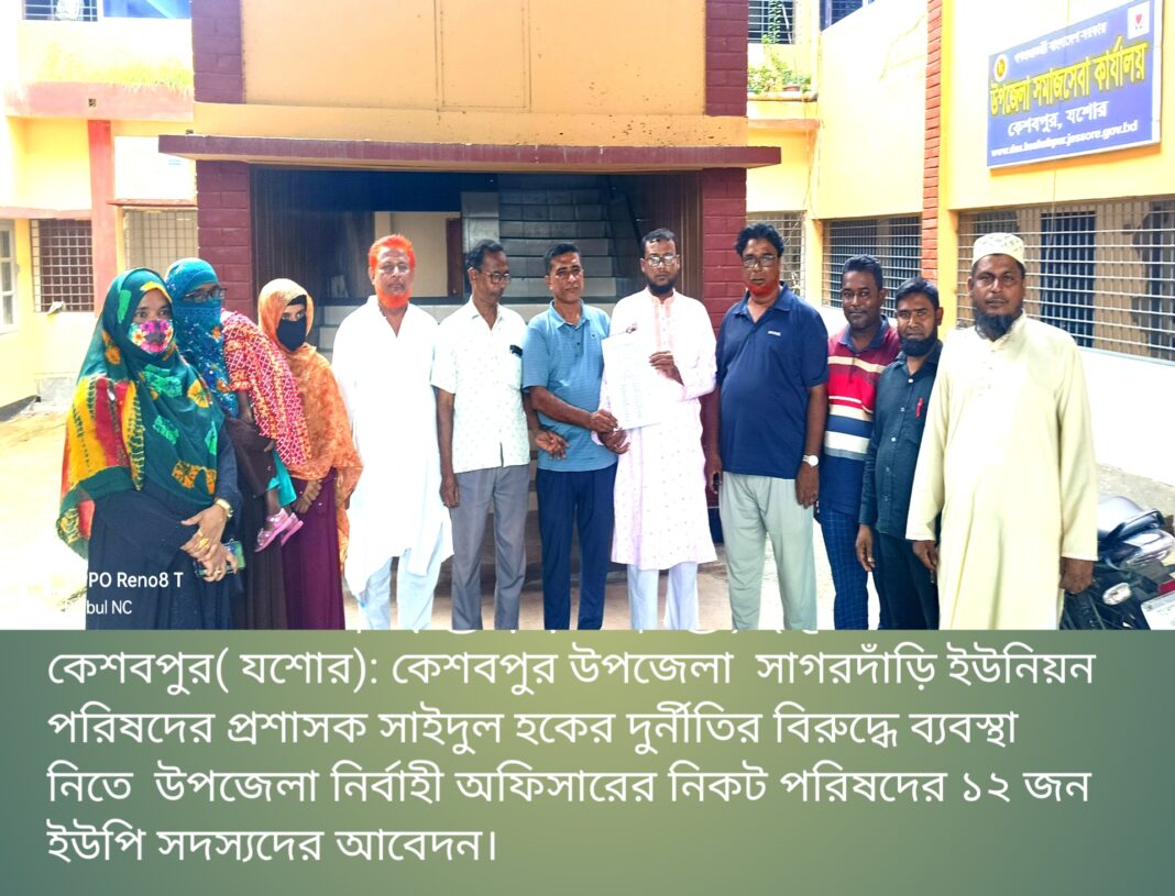 রবিবার (১০ আগষ্ট) বেলা ১ টার দিকে সাগরদাঁড়ি ইউনিয়ন পরিষদের প্যানেল চেয়ারম্যান মোঃ কামরুল ইসলামসহ ১২ ইউপি মেম্বর সাগরদাঁড়ি ইউনিয়ন পরিষদের প্রশাসক ও প্রাথমিক শিক্ষা ইনস্টাক্টর মোঃ সাইদুল হকের বিরুদ্ধে নানা অনিয়ম ও দুর্নীতির তদন্ত পূর্বক আইনগত ব্যবস্থা গ্রহনের জন্য কেশবপুর উপজেলা নির্বাহী অফিসারের নিকট একটি আবেদন করেছেন।