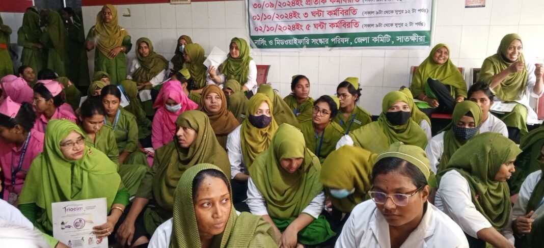 এক দফা দাবিতে সাতক্ষীরা সদর হাসপাতালে মঙ্গলবার সকাল ৯টা থেকে দুপুর ১২টা পর্যন্ত তিন ঘণ্টার কর্মবিরতি পালন করছেন নার্সরা। এ ছাড়া বুধবার (২ অক্টোবর) সকাল ৯টা থেকে দুপুর ২টা পর্যন্ত ৫ ঘণ্টা কর্মবিরতি পালন করবেন বলে ঘোষণা দিয়েছেন তারা। তবে কর্মবিরতির বাইরে রয়েছে হাসপাতালগুলো জরুরি বিভাগ এবং আইসিইউ, সিসিইউর মত গুরুত্বপূর্ণ ওয়ার্ডগুলো। সেসব ওয়ার্ডে আমাদের নার্সরা দায়িত্ব পালন করছেন।