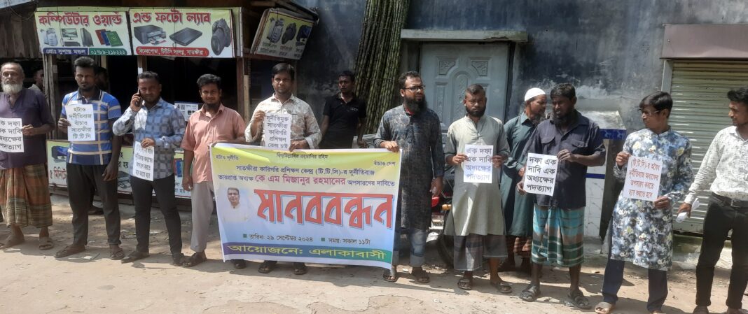 সাতক্ষীরা প্রতিনিধি :সাতক্ষীরার কারিগরি প্রশিক্ষণ কেন্দ্রের (টিটিসি) ভারপ্রাপ্ত অধ্যক্ষের অপসারণের দাবীতে মানববন্ধন অনুষ্ঠিত হয়েছে। রোববার (২৯ সেপ্টম্বর) বেলা সাড়ে ১১ টার সময় ভারপ্রাপ্ত অধ্যক্ষ কে এম মিজানুর রহমানের বিরুদ্ধে বিভিন্ন ট্রেডে ভর্তি বানিজ্য, প্রশিক্ষনার্থীদের টাকা আত্মসাৎ, বিভিন্ন উন্নয়ন প্রকল্পে ও ভূয়া বিল ভাউচারের মাধ্যমে লক্ষ লক্ষ টাকা লুটপাটসহ বিভিন্ন দূর্নীতির লেখা সম্বলিত লিফলেট ও পদত্যাগের প্লাকার্ড হাতে নিয়ে এলাকাবাসীর আয়োজনে সাতক্ষীরা কারিগরি প্রশিক্ষণ কেন্দ্রের (টিটিসি) প্রধান ফটকের সামনে মানববন্ধন অনুষ্ঠিত হয়েছে ।