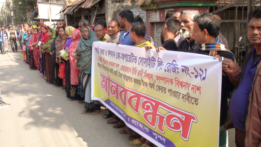 ফারুক রহমান, সাতক্ষীরা:সাতক্ষীরায় প্রগতি সঞ্চয় ও ঋণদান কো-অপারেটিভ সোসাইটির নির্বাহী পরিচালক প্রাণনাথ দাশ, তার স্ত্রী প্রতিষ্ঠানের চেয়ারম্যান ইতি রানী বিশ্বাস ও সম্পাদক বিশ্বনাথ দাশের বিরুদ্ধে গ্রাহকদের সঞ্চয়কৃত শত কোটি টাকা নিয়ে লোপাটের ঘটনায় মানববন্ধন কর্মসূচি পালন করেছে ভুক্তভোগী গ্রাহকরা।