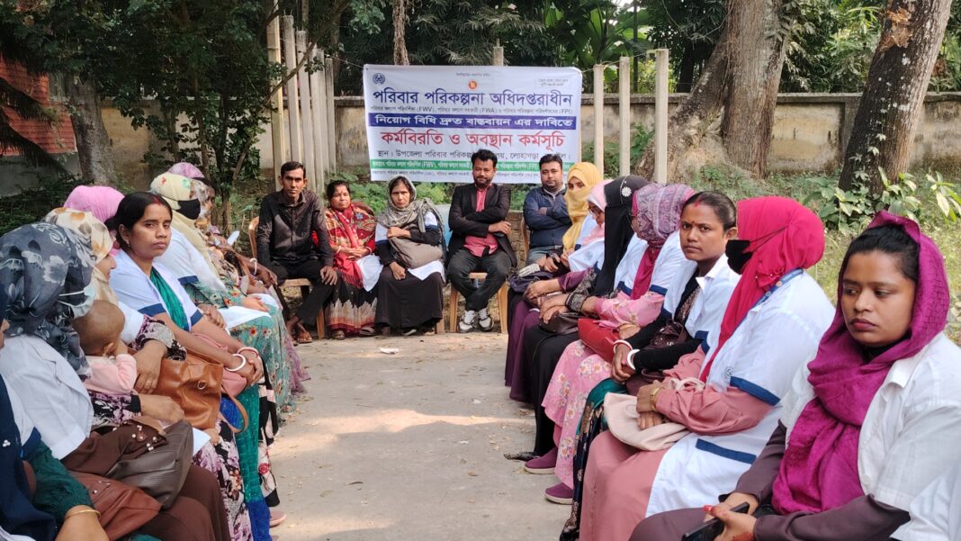 নড়াইলের লোহাগড়া উপজেলায় নিয়োগবিধির দাবিতে কর্মবিরতি ও অবস্থান কর্মসূচি করছেন উপজেলা পরিবার কল্যাণ পরিদর্শিকা (FWV),পরিবার কল্যাণ সহকারী (FWA) এবং পরিবার কল্যাণ পরিদর্শক (FPI) এর কর্মচারীরা।