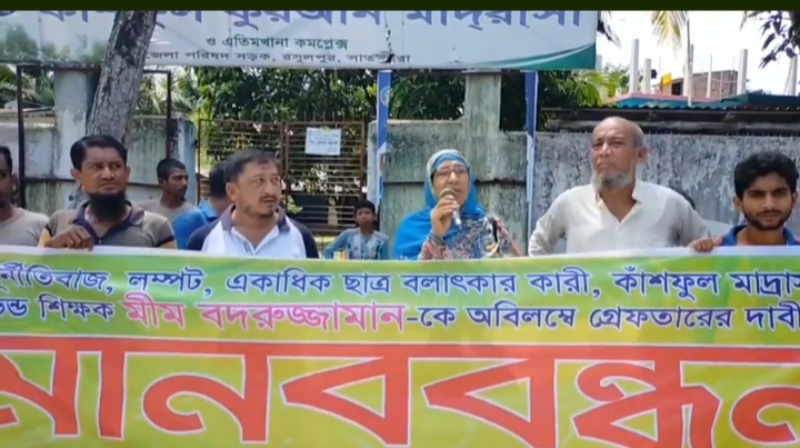 মানববন্ধনে বক্তারা বলেন, কাশফুল মাদ্রাসার শিক্ষক মীম বদরুজ্জামান দীর্ঘদিন ধরে কোমল মতি ছাত্রদের বলাৎকার করে আসছিল । তার এই জঘন্নতম অপরাধ ঢাকতে ছাত্রদের ভয়ভীতি দেখিয়ে আসছিল। সম্পত্তি এক ছাত্রকে বলৎকার করার চেষ্টা কালে বিষয়টি প্রকাশ্যে আসে। এই ঘটনায় ভুক্তভোগীর পিতা সাতক্ষীরা সদর থানায় একটি মামলা করেন। মামলা নং-২১।মামলার পর থেকে ওই শিক্ষক পলাতক রয়েছে। অবিলম্বে লম্পট শিক্ষক বদরুজ্জামানের গ্রেপ্তারের দাবি জানান তারা ।