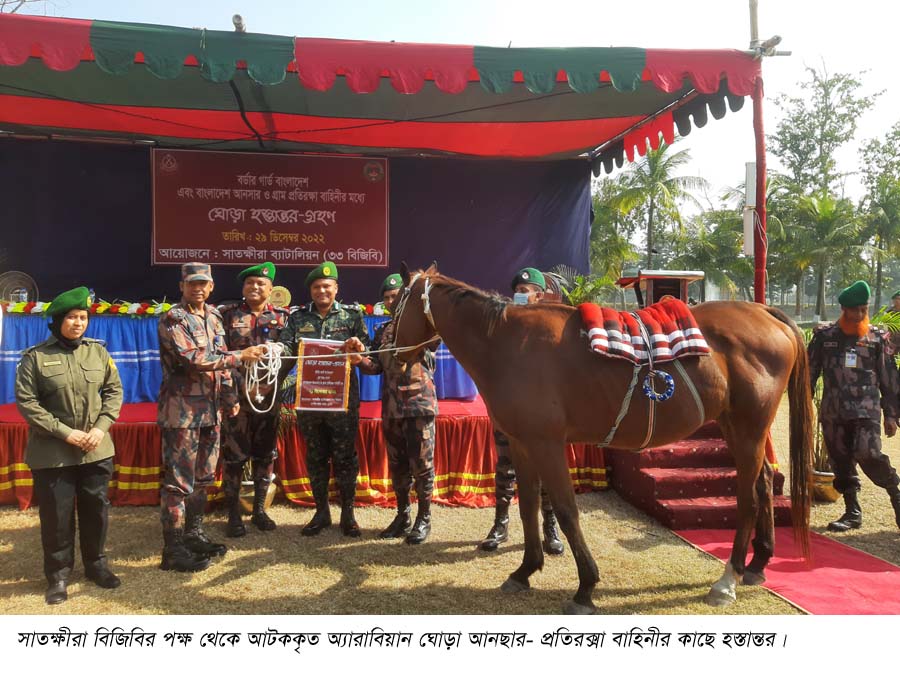 ভারতে পাচারকালে সাতক্ষীরা সদর উপজেলার বাশদাহ সীমান্ত থেকে উদ্ধারকৃত একটি আরবীয় রেসের ঘোড়া বাংলাদেশ আনসার ও গ্রাম প্রতিরা বাহিনীর কাছে হস্তান্তর করেছে বিজিবি।বৃহস্পতিবার দুপুরে সাতীরা ৩৩ বিজিবি ব্যাটালিয়নে বিজিবি’র খুলনা সেক্টর কমান্ডার কর্নেল মামুনুর রশীদ বাংলাদেশ আনসার ও গ্রাম প্রতিরা বাহিনীর উপ-মহাপরিচালক শাহ্ আহমেদ ফজলে রাব্বি’র কাছে এ ঘোড়া হস্তান্তর করেন। এ সময় বিজিবি’র সাতীরা ৩৩ ব্যাটালিয়নের অধিনায়ক লে. কর্ণেল মোঃ আল মাহমুদসহ বিভিন্ন কর্মকর্তারা উপস্থিত ছিলেন।বিজিবি’র খুলনা সেক্টর কমান্ডর কর্ণেল মামুনুর রশীদ সাংবাদিকদের বলেন, ভারতে পাচারকালে গত ১৫ আগষ্ট ভোরে সাতীরা র্সমান্তের বাশদাহ নামক স্থান থেকে থ্রুব্রেড জাতের আরিয়ান ওই ঘোড়াটি আটক করা হয়। অন্যান্য সাধারণ ঘোড়ার মত তাজা ঘাস, মানসম্মত খড়, ফল ও সবজি খেয়ে থাকে। এ জাতের ঘোড়া ত্রে বিশেষ ৩০ থেকে ৪০ বছর পর্যন্ত বাচে। ঘোড় দৌড়ের জন্য এ জাতের ঘোড়া সারা বিশ্বে চাহিদা রয়েছে। এর দাম ত্রে বিশেষে ২ থেকে ৩ কোটি টাকা হতে পারে। দেশের সুরার কাজে এ ঘোড়া ব্যবহার করা হবে বলে জানান বিজিবি কমান্ডার।