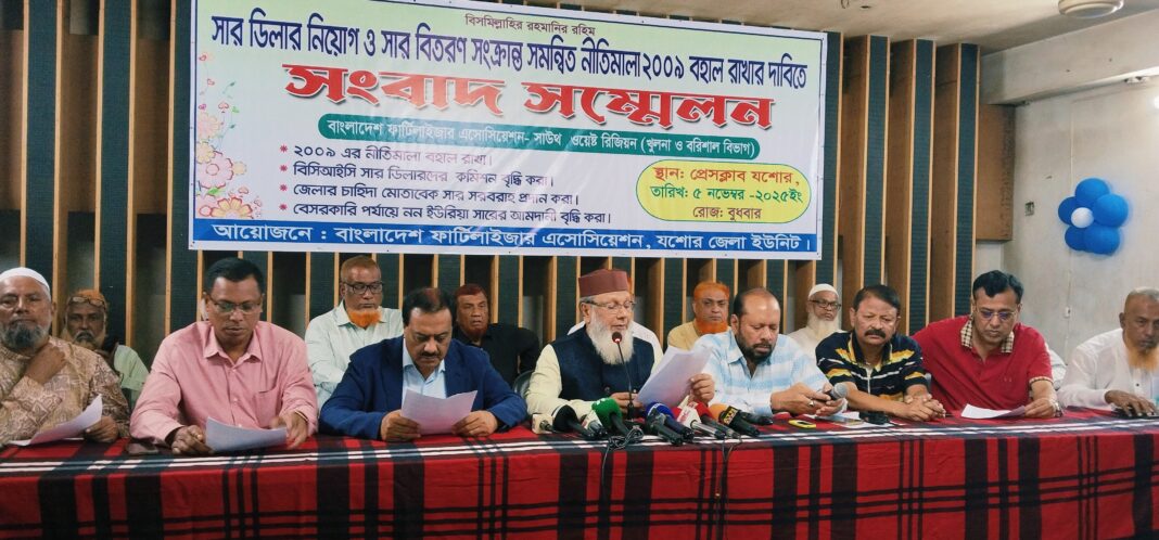 সার ডিলার নিয়োগ ও সার বিতরণসংক্রান্ত সমন্বিত নীতিমালা–২০২৫ বাতিল করে ২০০৯ সালের নীতিমালা বহালের দাবি জানিয়েছে বাংলাদেশ ফার্টিলাইজার অ্যাসোসিয়েশন (বিএফএ) খুলনা ও বরিশাল বিভাগ। আজ বুধবার (৫ নভেম্বর) দুপুরে প্রেসক্লাব যশোরে আয়োজিত এক সংবাদ সম্মেলনে এ দাবি জানানো হয়।