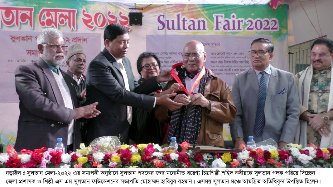 নড়াইল প্রতিনিধি:নড়াইলে ১৪দিনব্যাপি সুলতান মেলা শেষ হয়েছে গতকাল (শুক্রবার)। গতকাল সন্ধ্যায় সুলতান মঞ্চে নড়াইল জেলা প্রশাসক ও শিল্পী এস এম সুলতান ফাউন্ডেশনের সভাপতি মোহাম্মদ হাবিবুর রহমানের সভাপতিত্বে মেলার সমাপণী এবং পদক বিতরণ অনুষ্ঠানে উপস্থিত ছিলেন, নড়াইল জেলা পরিষদ চেয়ারম্যান ও জেলা আওয়ামী লীগের সভাপতি অ্যাডভোকেট সুবাস চন্দ্র বোস, নড়াইল সরকারি ভিক্টোরিয়া কলেজের অধ্যক্ষ প্রফেসর মোঃ রবিউল ইসলাম, সদর উপজেলা চেয়ারম্যান ও জেলা আওয়ামী লেিগর সাধারণ সম্পাদক নিজাম উদ্দিন খান নিলু, অতিরিক্ত পুলিশ সুপার (সদর সার্কেল) মোঃ দোলন মিয়া, বাংলাদেশ শিল্পকলা একাডেমীর পরিচালক মাহবুবা করিম মিনি, পপুলার লাইফ ইন্সুরেন্স কোঃ লিঃ এর মহাব্যবস্থাপক মোঃ তানভীর আল আজাদ, নড়াইল প্রেসকাবের সভাপতি এনামুল কবীর টুকু বিশিষ্ট নাট্যকার কচি খন্দকার, জাতীয় চলচিত্র পুরস্কারপ্রাপ্ত অভিনয় শিল্পী-২০২২ প্রভাষ কুমার ভট্টাচার্য্য মিলন, বীর মুক্তিযোদ্ধা সাইফুর রহমান হিলু, সংসদ সদস্য মাশরাফি বিন মোর্ত্তজার পিতা গোলাম মর্তুজা স্বপন, সম্মিলিত সাংস্কৃতিক জোট নড়াইল জেলা শাখার সভাপতি মলয় কুমার কুন্ডু প্রমুখ।