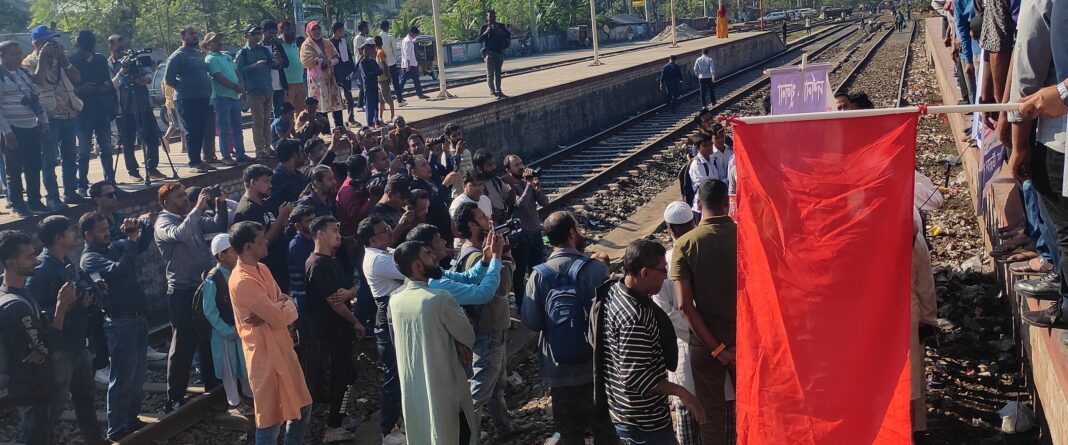 নিজস্ব প্রতিবেদক:পদ্মাসেতু রেল প্রকল্পের উদ্বোধনী দিনে বেনাপোল-যশোর-নড়াইল-ঢাকা রুটে দুটি ট্রেনসহ ৬ দফা দাবিতে যশোর রেল স্টেশনে রেল অবরোধ করা হয়েছে।
