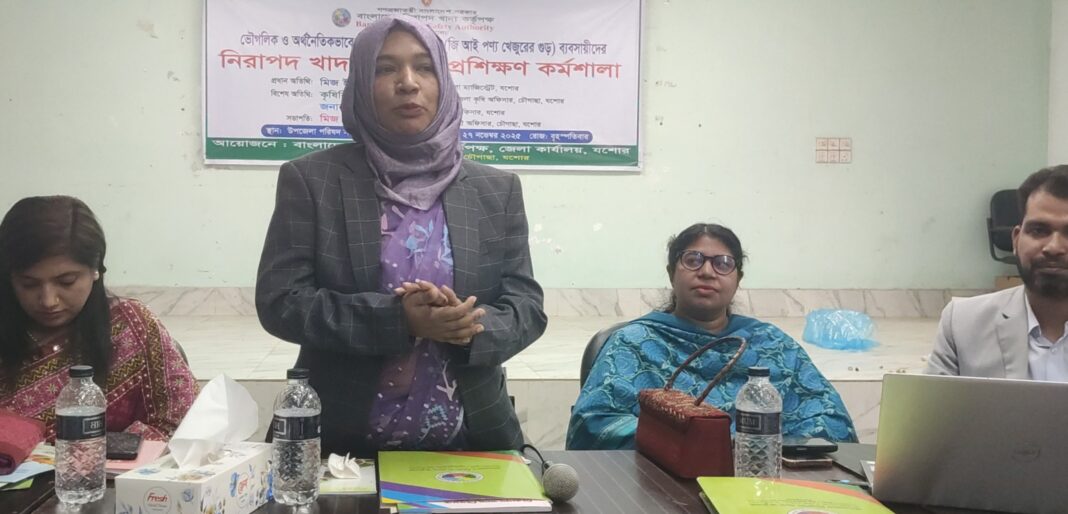 যশোরের জিআই পণ্য খেজুর গুড় উৎপাদনকারী গাছিদের নিরাপদ খাদ্য বিষয়ক প্রশিক্ষণ কর্মশালা অনুষ্ঠিত হয়েছে। নিরাপদ খাদ্য কর্তৃপক্ষ যশোর কার্যালয়ের আয়োজনে ও চৌগাছা উপজেলা প্রশাসনের সহযোগিতায় বৃহস্পতিবার (২৭নভেম্বর) বেলা ১১টা থেকে দিনব্যাপী এই কর্মশালা চৌগাছা উপজেলা পরিষদ হলরুমে অনুষ্ঠিত হয়।